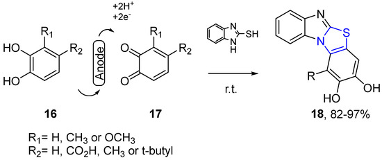 Khodaei et al. obtained tetracyclic imidazo[2,1-b]thiazoles 18 via electrochemically induced tandem heteroannulation reactions. The catechol-fused tetracyclic compounds were synthesized in aqueous solution through the anodic oxidation of catechols in the presence of 2-mercaptobenzimidazole. The benzimidazo[2,1-b]thiazoles 18 were obtained through a domino reaction of commercially available starting materials 16–17 [27]. Besides the high efficiency and atom economy as a domino process, this reaction where only electrons are used as reagents is an environmentally benign transformation compared to oxidative ones (Scheme 5).