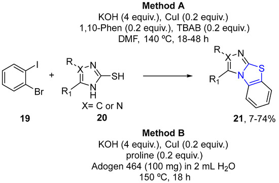 The Beresneva group developed a simple method for the preparation of benzo-fusedimidazo[2,1-b]thiazoles and [1,2,4]triazolo[5,1-b][1,3]benzothiazole 21 in the system solid KOH/CuI/1,10-phen/TBAB/DMF from 1-bromo-2-iodobenzene 19 and corresponding thiols 20 by S,N-tandem arylation reactions (Scheme 6) [28].