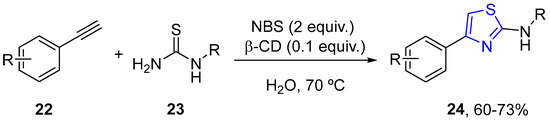Madhav and co-workers reported, for the first time, the use of the one-pot tandem procedure for the synthesis of thiazoles/selenazoles from alkynes 22, forming 2,2-dibromo-1-phenylethanone as an intermediate. The group developed a convenient one-pot aqueous phase synthesis of substituted thiazoles 24 under mild conditions in good yields (Scheme 7) [29].