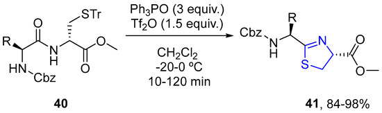 You and co-workers described an efficient biomimetic synthesis of thiazolines by treating N-acylated cysteine substrates 40 with hexaphenyloxodiphosphonium tri-fluoromethanesulfonate to activate the amide group. The reaction proceeded in high yield with a retention of configuration at the C4-and C2-exomethine carbon atoms of the thiazoline 41. The application of this method to tandem dehydrocyclizations afforded a thiazole-thiazoline product with excellent stereocontrol and in good overall yield (Scheme 12) [34].