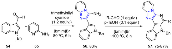 Yan and co-workers carried out a very efficient tandem process for the synthesis of pyridoimidazo-fused ß-carbolines 57. These compounds were obtained by a one-pot three-component reaction of 1-benzyl-1H-indole-3-carbaldehyde 54, 2-aminopyridine 55, and trimethylsilyl cyanide via the Groebke–Blackburn–Bienaymé reaction; then, acyclization through the Pictet–Spengler reaction of the resulting imidazo[1,2-a]pyridine 56 allowed access to the desiredheterocycles 57 (Scheme 18) [40].