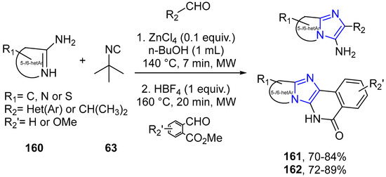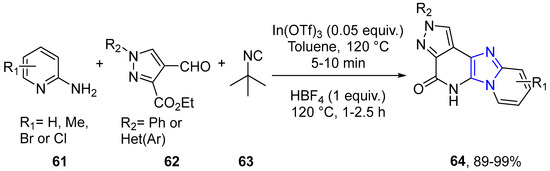 Devi et al. managed to obtain pyrazolopyridinone-fused imidazopyridines 64 from 4-formyl-1H-pyrazole-3-carboxylates 62, 2-aminopyridines 61, and tert-butyl isonitrile as the starting materials in moderate to good yields. The results were achieved using In(OTf)3-HBF4 as an efficient catalytic system (Scheme 20) [42].