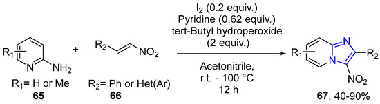 - An, L.; Sun, X.; Lv, M.; Zhou, J.; Zhu, F.; Zhong, H. Metal-free oxidative coupling of aminopyridines with nitroolefins to imidazo[1,2-a]pyridine in the presence of I2–TBHP–pyridine. Z. Nat. B 2016, 71, 141–147. [Google Scholar] [CrossRef]