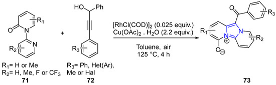 - Li, T.; Wang, Z.; Xu, K.; Liu, W.; Zhang, X.; Mao, W.; Guo, Y.; Ge, X.; Pan, F. Rhodium-Catalyzed/Copper-Mediated Tandem C(sp2)–H Alkynylation and Annulation: Synthesis of 11-Acylated Imidazo[1,2-a:3,4-a′]dipyridin-5-ium-4-olates from 2H-[1,2′-Bipyridin]-2-ones and Propargyl Alcohols. Org. Lett. 2016, 18, 1064–1067. [Google Scholar] [CrossRef] [PubMed]
