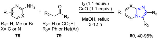 - Cai, Q.; Liu, M.-C.; Mao, B.-M.; Xie, X.; Jia, F.-C.; Zhu, Y.-P.; Wu, A.-X. Direct one-pot synthesis of zolimidine pharmaceutical drug and imidazo[1,2-a]pyridine derivatives via I2/CuO-promoted tandem strategy. Chin. Chem. Lett. 2015, 26, 881–884. [Google Scholar] [CrossRef]