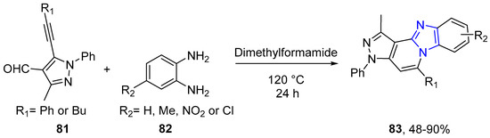 - Milišiūnaitė, V.; Arbačiauskienė, E.; Bieliauskas, A.; Vilkauskaitė, G.; Šačkus, A.; Holzer, W. Synthesis of pyrazolo[4′,3′:3,4]pyrido[1,2-a]benzimidazoles and related new ring systems by tandem cyclisation of vic-alkynylpyrazole-4-carbaldehydes with (het) aryl-1,2-diamines and investigation of their optical properties. Tetrahedron 2015, 71, 3385–3395. [Google Scholar] [CrossRef]