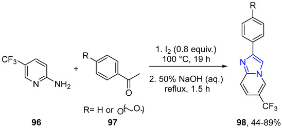 Wang et al. investigated an I2/DMAP-promoted amination/cyclization of methyl ketones or 1,3-dicarbonylcompounds with 2-aminopyridines 59. This team showed that a wide range of acetophenones were suitable substrates for this tandem cyclization reaction, including both electron-rich and electron-deficient groups on the para-, meta-, or ortho-position of the aryl ring.Theexpected2-aryl-imidazo[1,2-a]pyridines 60 were synthesized in good yields (Scheme 19) [41].