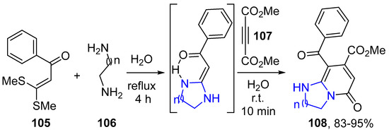 - Chanu, L.G.; Singh, T.P.; Jang, Y.J.; Yoon, Y.-J.; Singh, O.M.; Lee, S.-G. Synthesis of Imidazo[1,2-a]pyridines and Pyrido[1,2-a]pyrimidines in Water and their SNAr Cyclizations. Bull. Korean Chem. Soc. 2014, 35, 994–1000. [Google Scholar] [CrossRef]