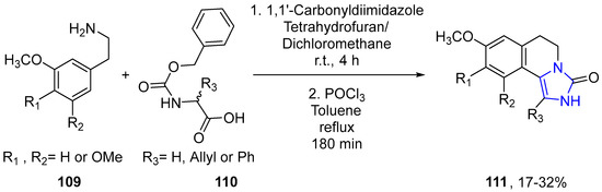 - Cherney, E.; Macor, J.; Papanagapolous, C.; Hunt, D.A. Tandem cyclization reactions of electron rich arylethylamino acid amides. An entry to the dihydroimidazoisoquinolin-3(2H)-one ring system. Tetrahedron Lett. 2014, 55, 4837–4839. [Google Scholar] [CrossRef]