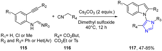 - Hao, W.; Jiang, Y.; Cai, M. Synthesis of Indolyl Imidazole Derivatives via Base-Promoted Tandem Reaction of N-[2-(1-Alkynyl)phenyl]carbodiimides with Isocyanides. J. Org. Chem. 2014, 79, 3634–3640. [Google Scholar] [CrossRef]