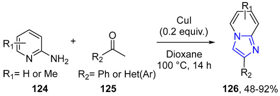 - Bagdi, A.K.; Rahman, M.; Santra, S.; Majee, A.; Hajra, A. Copper-Catalyzed Synthesis of Imidazo[1,2-a]pyridines through Tandem Imine Formation-Oxidative Cyclization under Ambient Air: One-Step Synthesis of Zolimidine on a Gram-Scale. Adv. Synth. Catal. 2013, 355, 1741–1747. [Google Scholar] [CrossRef]