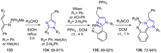 - Nie, Y.-B.; Duan, Z.; Ding, M.-W. New efficient synthesis of 1,2,4-trisubstituted imidazoles and imidazo[1,2-c]quinazolines by a tandem aza-Wittig/electrocyclic ring-closure process. Tetrahedron 2012, 68, 965–971. [Google Scholar] [CrossRef]