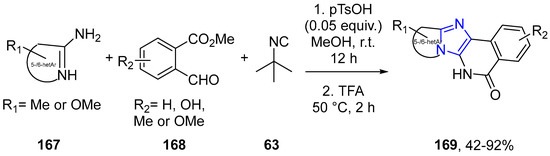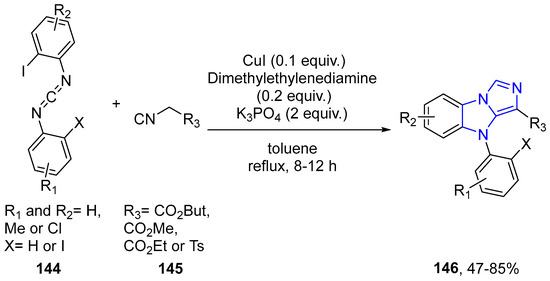 - Qiu, G.; Wu, J. Generation of benzoimidazo[1,5-a]imidazoles via a copper-catalyzed tandem reaction of carbodiimide and isocyanoacetate. Chem. Commun. 2012, 48, 6046–6048. [Google Scholar] [CrossRef] [PubMed]