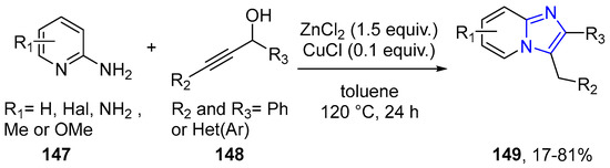 - Ramesha, A.B.; Raghavendra, G.M.; Nandeesh, K.N.; Rangappa, K.S.; Mantelingu, K. Tandem approach for the synthesis of imidazo[1,2-a]pyridines from alcohols. Tetrahedron Lett. 2013, 54, 95–100. [Google Scholar] [CrossRef]