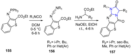 - Xu, S.-Z.; Wu, J.; Cao, M.-H.; Ding, M.-W. Efficient synthesis of benzothieno[3,2-d]-imidazo[1,2-a]pyrimidine-2,5-(1H, 3H)-diones via a tandem aza-wittig/heterocumulene-mediated annulation. J. Heterocycl. Chem. 2010, 47, 68–71. [Google Scholar] [CrossRef]