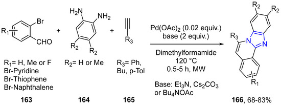 - Ouyang, H.-C.; Tang, R.-Y.; Zhong, P.; Zhang, X.-G.; Li, J.-H. CuI/I2-Promoted Electrophilic Tandem Cyclization of 2-Ethynylbenzaldehydes with ortho-Benzenediamines: Synthesis of Iodoisoquinoline-Fused Benzimidazoles. J. Org. Chem. 2011, 76, 223–228. [Google Scholar] [CrossRef] [PubMed]