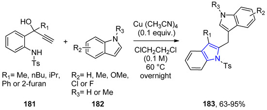 - Li, H.; Li, X.; Wang, H.-Y.; Winston-McPherson, G.N.; Geng, H.-M.J.; Guzeic, I.A.; Tang, W. Copper-catalyzed tandem annulation/arylation for the synthesis of diindolylmethanes from propargylic alcohols. Chem. Commun. 2014, 50, 12293–12296. [Google Scholar] [CrossRef]