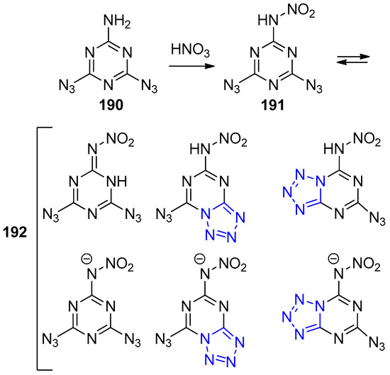 - Chapyshev, S.V.; Ushakov, E.N. Tandem deprotonation/azide–tetrazole tautomerization of 4,6-diazido-N-nitro-1,3,5-triazin-2-amine in dimethylsulfoxide solutions: A theoretical study. Phys. Chem. Chem. Phys. 2015, 17, 17296–17300. [Google Scholar] [CrossRef] [PubMed]