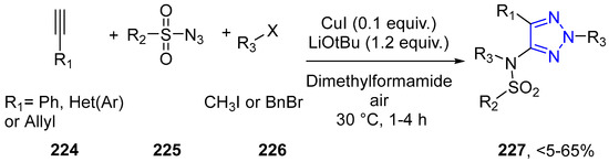 - Duan, X.; Huang, X.; Fu, C.; Ma, S. Palladium-Catalyzed Highly Selective Three-Component Tandem Reaction to Bicyclic 1,2,3-Triazole Derivatives. Adv. Synth. Catal. 2019, 362, 627–647. [Google Scholar] [CrossRef]
