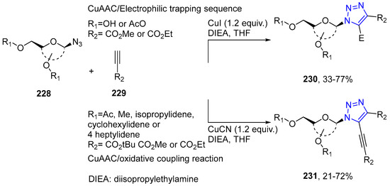 - Kaliappan, K.P.; Kalanidhi, P.; Mahapatra, S. ‘Click’ Chemistry on Sugar-Derived Alkynes: A Tandem ‘Click-Click’ Approach to Bistriazoles. Synlett 2009, 13, 2162–2166. [Google Scholar] [CrossRef]