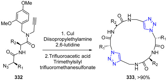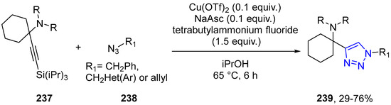 - Palchak, Z.L.; Nguyen, P.T.; Larsen, C.H. Synthesis of alpha-tetrasubstituted triazoles by copper-catalyzed silyl deprotection/azide cycloaddition. Beilstein J. Org. Chem. 2015, 11, 1425–1433. [Google Scholar] [CrossRef] [PubMed]