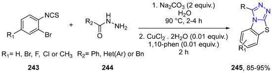 - Wen, L.-R.; Li, S.-L.; Zhang, J.; Li, M. Convenient synthesis of benzo[4,5]thiazolo[2,3-c][1,2,4]triazoles with 1 mol% CuCl2·2H2O as catalyst in water. Green Chem. 2015, 17, 1581–1588. [Google Scholar] [CrossRef]