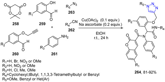 - Shaabani, S.; Shaabani, A.; Ng, S.W. One-Pot Synthesis of Coumarin-3-carboxamides Containing a Triazole Ring via an Isocyanide-Based Six-Component Reaction. ACS Comb. Sci. 2014, 16, 176–183. [Google Scholar] [CrossRef] [PubMed]