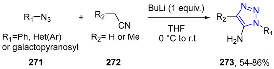 - Gomes, A.T.P.C.; Martins, P.R.C.; Rocha, D.R.; Neves, M.G.P.M.S.; Ferreira, V.F.; Silva, A.M.S.; Cavaleiro, J.A.S.; da Silva, F.C. Consecutive Tandem Cycloaddition between Nitriles and Azides; Synthesis of 5-Amino-1H-[1,2,3]-triazoles. Synlett 2013, 24, 41–44. [Google Scholar] [CrossRef]