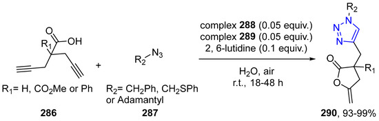 - García-Álvarez, J.; Díez, J.; Vidal, C. Pd(ii)-catalyzed cycloisomerisation of γ-alkynoic acids and one-pot tandem cycloisomerisation/CuAAC reactions in water. Green Chem. 2012, 14, 3190–3196. [Google Scholar] [CrossRef]