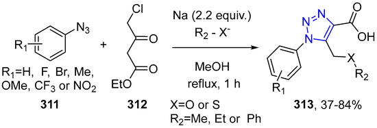 - Pokhodylo, N.T.; Matiychuk, V.S.; Obushak, M.D. Synthesis of 1-(R-Phenyl)-5-(R-Methyl)-1H-1,2,3-triazole-4-carboxylic Acids by One-Pot Tandem Reaction. Synth. Commun. 2010, 40, 1932–1938. [Google Scholar] [CrossRef]