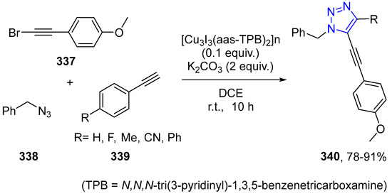 - Guo, X.; Huang, C.; Yang, H.; Shao, Z.; Gao, K.; Qin, N.; Li, G.; Wu, J.; Hou, H. Cu (i) coordination polymers (CPs) as tandem catalysts for three-component sequential click/alkynylation cycloaddition reaction with regiocontrol. Dalton Trans. 2018, 47, 16895–16901. [Google Scholar] [CrossRef] [PubMed]