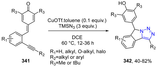 - Jadhav, A.S.; Pankhade, Y.A.; Anand, R.V. Tandem One-Pot Approach to Access 1,2,3-Triazole-fused Isoindolines through Cu-Catalyzed 1,6-Conjugate Addition of Me3SiN3 to p-Quinone Methides followed by Intramolecular Click Cycloaddition. J. Org. Chem. 2018, 83, 8596–8606. [Google Scholar] [CrossRef] [PubMed]