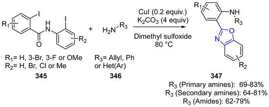- Kavala, V.; Janreddy, D.; Raihan, M.J.; Kuo, C.-W.; Ramesh, C.; Yao, C.-F. One-Pot Tandem Synthesis of 2-Arylbenzoxazole Derivatives via Copper-Catalyzed C-N and C-O Bond Formation. Adv. Synth. Catal. 2012, 354, 2229–2240. [Google Scholar] [CrossRef]