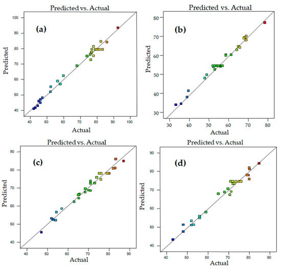 The predicted vs. actual value graphs for biodiesel yield depicts the fitness of the selected quadratic model. The graphs of predicted vs. actual values are shown in Figure 1, where Figure 1a–d describes the predicted vs. actual graphs based on experimental data about yield of biodiesel obtained through the transesterification of waste chicken fat oil by Fe3O4_PDA_Lipase (Figure 1a), Aspergillus terreus lipase (Figure 1b), sodium methoxide (Figure 1c) and KOH (Figure 1d). The distribution of the data along the straight line and the small difference between the predicted and actual value reveals the fitness of the quadratic model for all four experimental designs.