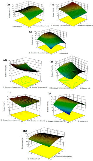 The 3D surface plots of the significant 1st order interaction terms are presented in Figure 2. Figure 2a–c presents the significant 1st order interaction terms of Model (a). Figure 2a shows the 3D surface plot between the methanol-to-oil ratio and reaction time; it reveals that the yield increases with an increase in reaction time and methanol:oil, but further increases in the methanol-to-oil ratio resulted in a decreased biodiesel yield. The joint impact of time and concentration to increase the biodiesel yield is given in Figure 2b. Figure 2c presents the 3D plot between bio-catalyst/enzyme concentration and methanol:oil for Model (a). The plot shows that enzyme concentration directly increases the biodiesel yield but the increase of metahonl:oil after a specific limit decreases the biodiesel yield.