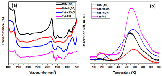 (a) Fourier transformation infrared (FT-IR) spectrum; and (b) ammonia temperature programmed desorption (NH3-TPD) profiles of sulfonated incomplete carbonized glucose (ICG) catalysts; ICG sulfonated by thermal treatment with concentrated sulfuric acid; ICG sulfonated by thermal treatment with ammonium sulphate; ICG sulfonated by thermal treatment with chlorosulfonic acid in chloroform; ICG sulfonated by in situ polymerization of poly(sodium4-styrene sulfonate).