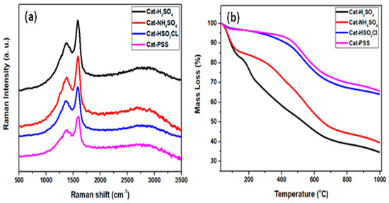 (a) Raman spectra and (b) thermogravimetric analysis (TGA) profiles of sulfonated ICG catalysts; ICG sulfonated by thermal treatment with concentrated sulfuric acid; ICG sulfonated by thermal treatment with ammonium sulphate; ICG sulfonated by thermal treatment with chlorosulfonic acid in chloroform; ICG sulfonated by in-situ polymerization of poly (sodium4-styrene sulfonate).