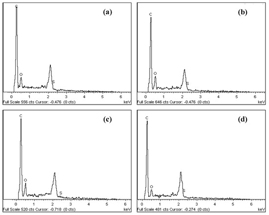The SEM images and elemental arrangement for all the sulfonated products are shown in Figure 3; Figure 4, respectively. As expected, the carbon sheets composed predominantly of polycyclic aromatic species coupling with enormous quantities of SO3H groups, which were similar to images depicted by other researchers [28]. As outlined in Table 1 from the EDX data, PSS-ICG possessed the highest binding content of S element (7.87%) and O (10.85%), followed by HSO3Cl-ICG with content of S element (6.26%) and O (9.82%); NHSO4-ICG; S element (4.51%), O element (36.16%), H2SO4-ICG with S element (1.91 %), O element (33.83%).