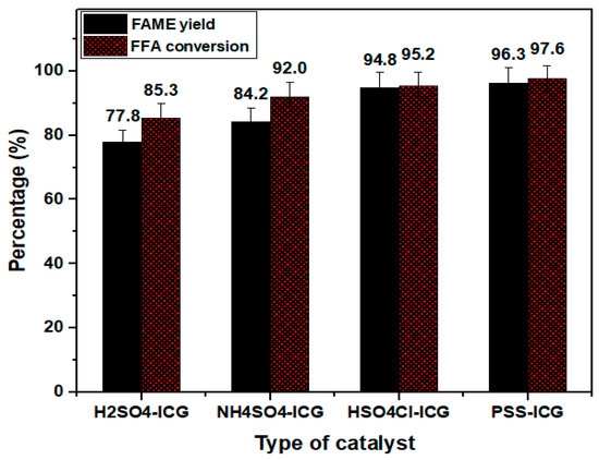 The catalytic performance of sulfonated catalysts was examined through the esterification of PFAD. The FFA conversions for each catalyst were assessed via titration route and later the values were calculated using Equation (2). The esterification reaction conditions were used as follows; operating temperature of 80 °C, operating time of 4 h, methanol to oil molar ratio of 10:1, and catalyst amount of 2.5%. According to the obtained results shown in Figure 5, the presence of PSS-ICG (D) gave the highest FFA conversion of 97.6% followed by HSO3Cl-ICG (C) of 95.2%, NHSO4-ICG (B) of 89.8%; and H2SO4-ICG (A) of 85.3%. It can be concluded that catalysts with a superior total acidity yielded higher FFA conversion in turn.