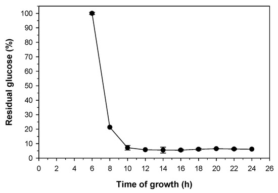 We first developed a simple and fast test to evaluate the effect of P. pastoris growing time on the further consumption of glucose. Thus, samples from a P. pastoris culture were taken every two hours (after an initial lag phase of 6 h), and the absorbance at 600 nm (as turbidity measurement) of all samples was adjusted to the absorbance at 6 h, to have the same concentration of cells but with different growing times. The P. pastoris cells were then mixed with a solution containing 1 g/L of both D-glucose and D-galactose, and the mixture was incubated for 10 min at 30 °C. The cells were separated by centrifugation and the concentration of both sugars was analyzed by HPAEC-PAD (Figure 1). Our results showed that the most voracious cells were those corresponding to 12–16 h growing time. It is well reported that these times correspond the exponential phase of growth of P. pastoris [48].