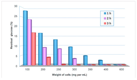 The next step was to determine the amount of cells (grown for 16 h) required to consume the glucose (90–100 g/L) released after lactose hydrolysis in whey permeate. Different amounts of Pichia pastoris cells (100–600 mg of wet weight) were added to 1 mL of a solution containing 100 g/L of D-glucose and 100 g/L D-galactose. The residual glucose was analyzed at 1, 2 and 3 h by HPAEC-PAD (Figure 2). As illustrated, the glucose disappeared in one hour using 600 mg of P. pastoris cells per mL. However, adding 350 mg of cells per mL, the total disappearance of glucose took place in two hours, and the mass transfer limitations were less significant than with 600 mg cells per mL. On this basis, we selected 350 mg of cells per mL (3 h incubation) to assure the elimination of glucose in the integrated 3-step process for D-tagatose synthesis.