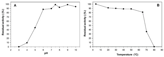 Stability of L-arabinose isomerase US100 from Bacillus stearothermophilus towards: (A) pH; (B) temperature. The pre-incubation time in both cases was 1 h.
