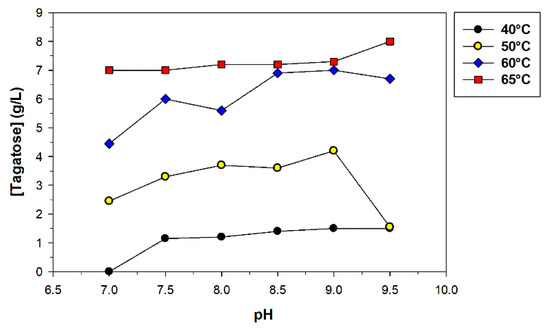 Furthermore, we analysed the effect of pH and temperature on the production of D-tagatose. We selected the range of pH (7.0–9.5) and temperature (40–65 °C) at which the L-arabinose isomerase from B. stearothermophilus was stable (see Figure 3). The reactions were carried out with 20 g/L galactose in 100 mM MOPS buffer for 4 h, in presence of 0.5 mM MnSO4. Results are shown in Figure 5. It remains clear that temperature substantially affects the reaction course. The highest production of D-tagatose in 4 h (7–8 g/L, 35–40% yield) was achieved at 65 °C. The reaction was 6–7 fold faster than at 40 °C. Regarding the pH, its effect was very much lower than that of temperature (Figure 5).