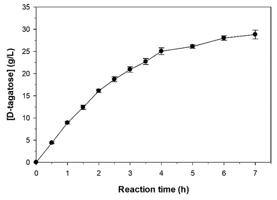 Figure 7 shows the progress of D-tagatose formation over time. The concentration of D-tagatose increases rapidly during the first four hours and then tends to stabilize in approximately 30 g/L. Starting of a whey permeate with 180 g/L lactose, the yield of D-tagatose referred to lactose was 16.7%, and 33.3% referred to the D-galactose present in whey. We believe that this yield could be improved by using a higher concentration of L-AI thus minimizing the enzyme inactivation effects (see Figure 3).