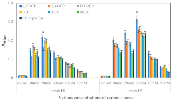 - Muslem, W.H.; Huyop, F.; Zakaria, I.I.; Wahab, R.A. Isolation and characterization of a biodegrading 3-chloropropionic acid Burkholderia cepacia WH1 isolated from abandoned agricultural land. Asia Pac. J. Mol. Biol. Biotechnol. 2015, 23, 268–279. [Google Scholar]