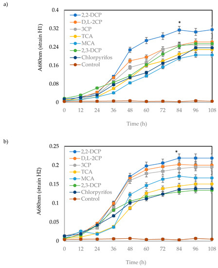 - Thasif, S.; Hamdan, S.; Huyop, F. Degradation of d,l-2-chloropropionic acid by bacterial dehalogenases that shows stereospecificity and its partial enzymatic characteristics. Biotechnology 2009, 8, 264–269. [Google Scholar]