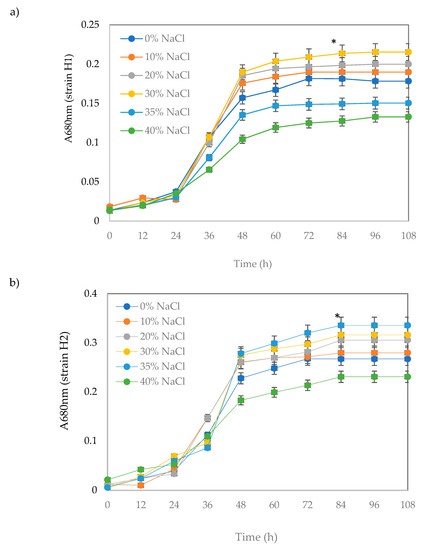 2.3.2. Bacterial Growth at Different NaCl Concentrations