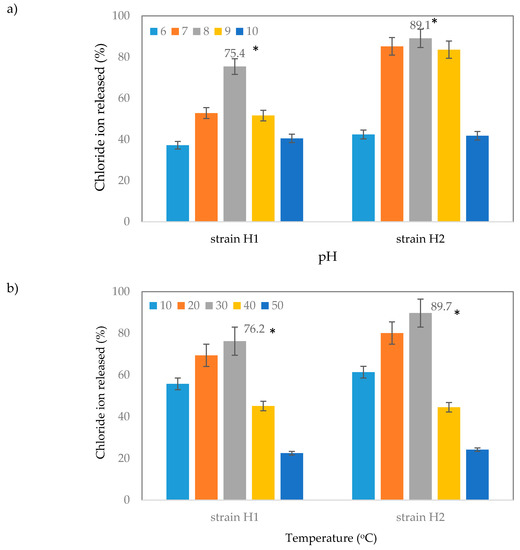 - Akcay, K.; Kaya, Y. Isolation, characterization and molecular identification of a halotolerant Bacillus megaterium CTBmeg1 able to grow on halogenated compounds. Biotechnol. Biotechnol. Equip. 2019, 33, 945–953. [Google Scholar] [CrossRef]