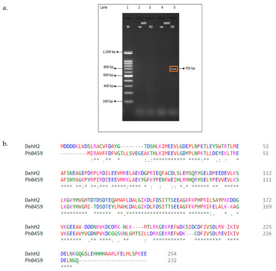 - Nemati, M.; Abdulghader, M.F.; Gicana, R.G.; Lamis, R.J.S.; Ibrahim, N.; Hamid, A.A.A.; Huyop, F. Identification of putative cof-like hydrolase associated with dehalogenase in enterobacter cloacae mn1 isolated from the contaminated sea-side area of the Philippines. Malays. J. Microbiol. 2013, 9, 253–259. [Google Scholar] [CrossRef][Green Version]