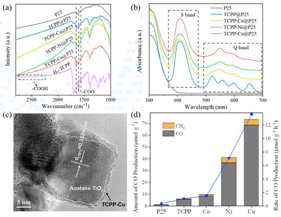 (a) FT–IR spectra of P25, H2TCPP, TCPP@P25 and TCPP-M@P25 (M = Co, Ni, Cu); (b) UV–Vis spectra of P25, TCPP@P25 and TCPP-M@P25 (M = Co, Ni, Cu); (c) HRTEM image of TCPP-Cu@P25; (d) evolution rates of CO and CH4 over P25, TCPP@P25 and TCPP-M@P25 (M = Co, Ni, Cu) under Xe lamp irradiation.